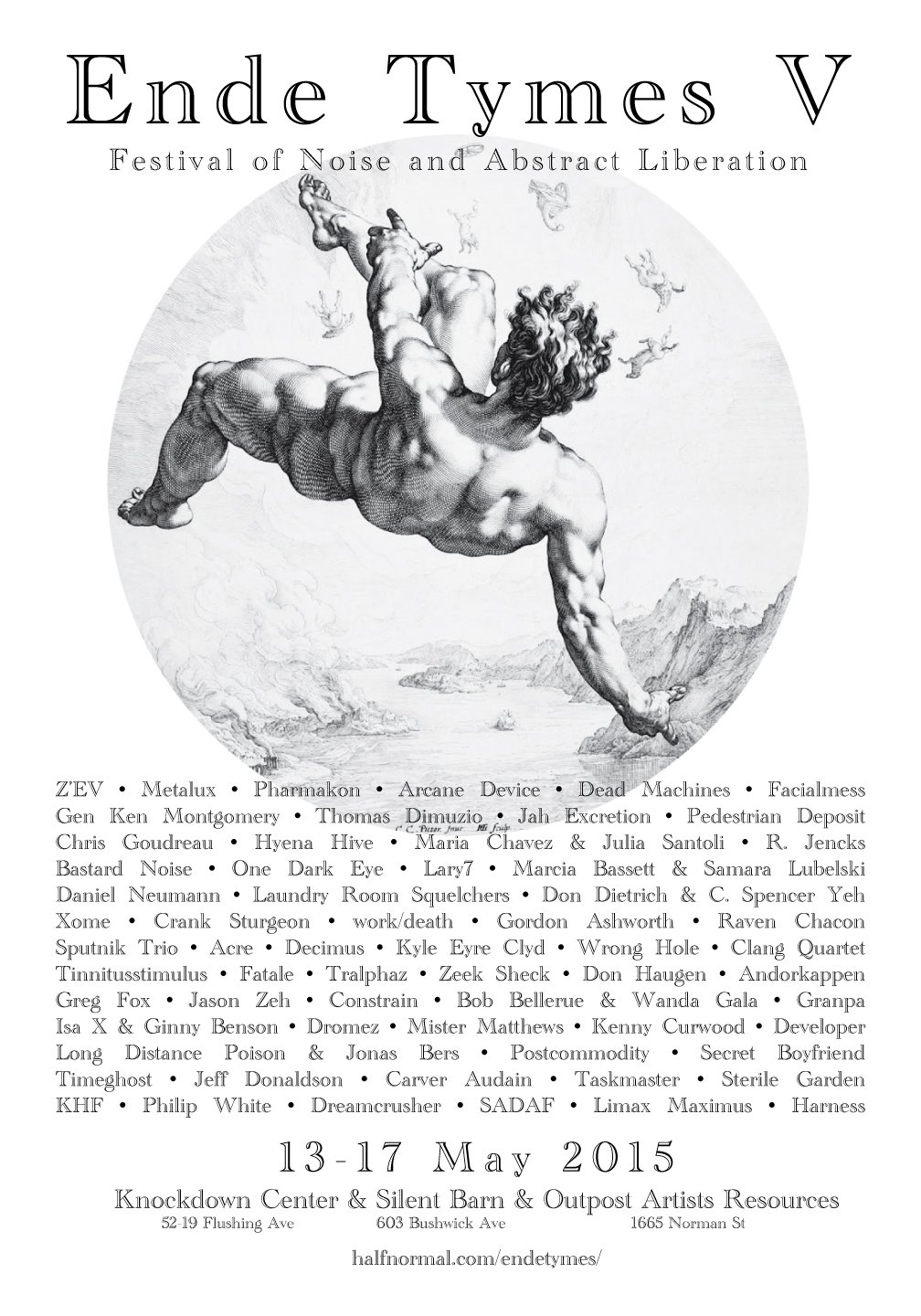 ENDE TYMES V FESTIVAL OF NOISE AND ABSTRACT LIBERATION 13-17 MAY 2015 KNOCKDOWN CENTER & SILENT BARN & OUTPOST ARTISTS RESOURCES May 13 Knockdown Center, 52-19 Flushing Ave, Maspeth May 14-16 Silent Barn, 603 Bushwick Ave, Bushwick May 17 Outpost Ar ...