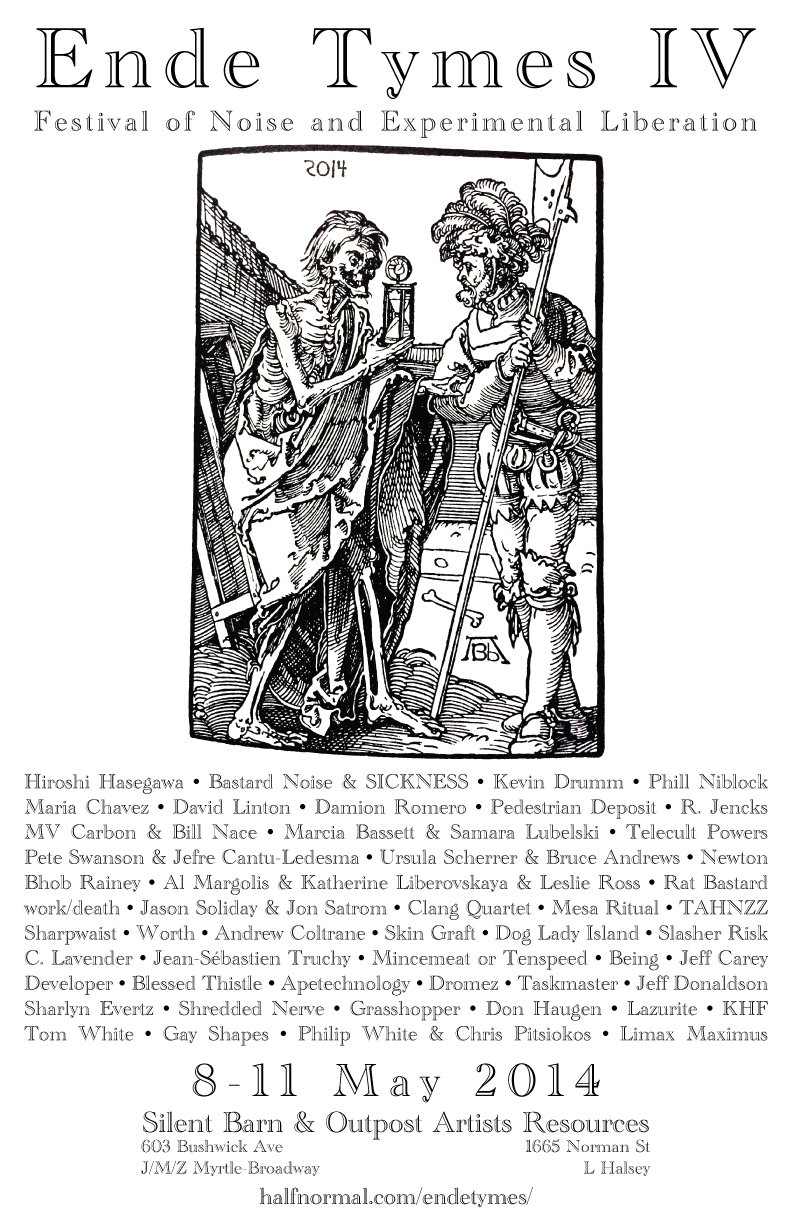 ENDE TYMES IV FESTIVAL OF NOISE AND EXPERIMENTAL LIBERATION 4 DAYS of NOISE and VIDEO ART 8-11 MAY 2014 SILENT BARN and OUTPOST ARTISTS RESOURCES News: ADVANCE TICKETS :: weekend passes and individual night tickets can be purchased via paypal to BOB@HALFNORMAL.COM - PLEASE send as a payment to friends and family (ie NO FEES). ...